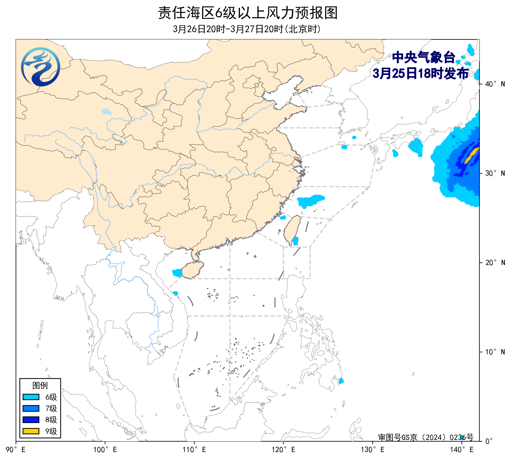 26日20时至27日20时,东海南部海域将有5~6级、阵风7级的东北风。