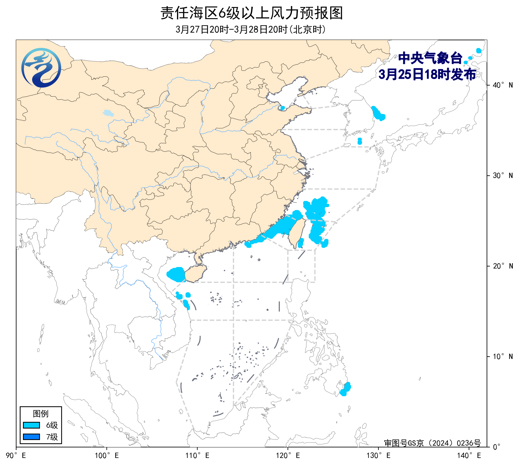 3月25日02时至14时,东海北部海域出现了6~7级、阵风8级的偏北风,东海南部海域出现了5~6级、阵风7级的旋转风。黄海北部和中部海域出现了能见度不及1公里的大雾。