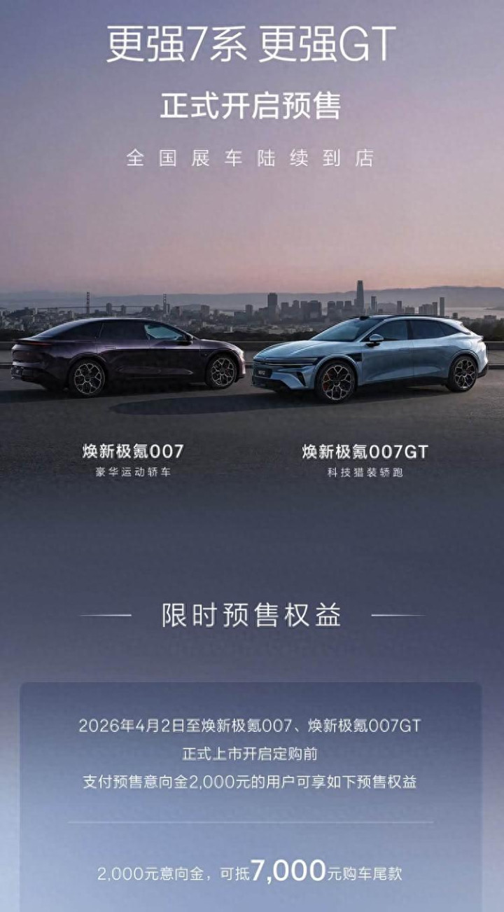新款极氪007与007GT精致开启预售,全系升级900V高压架构,并带来FR-LINE性能套装等多项更新。新车将于4月10日精致上市,当今支付2000元预售意向金可抵扣7000元购车尾款。